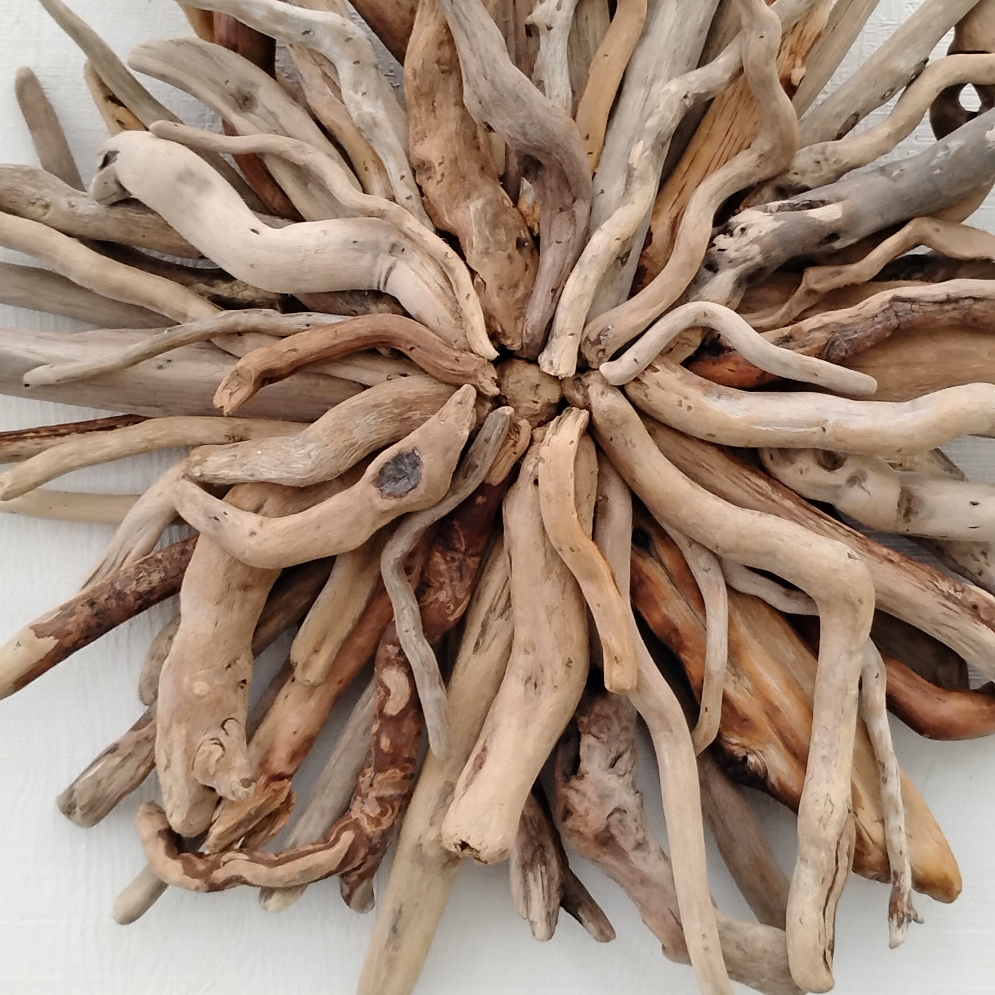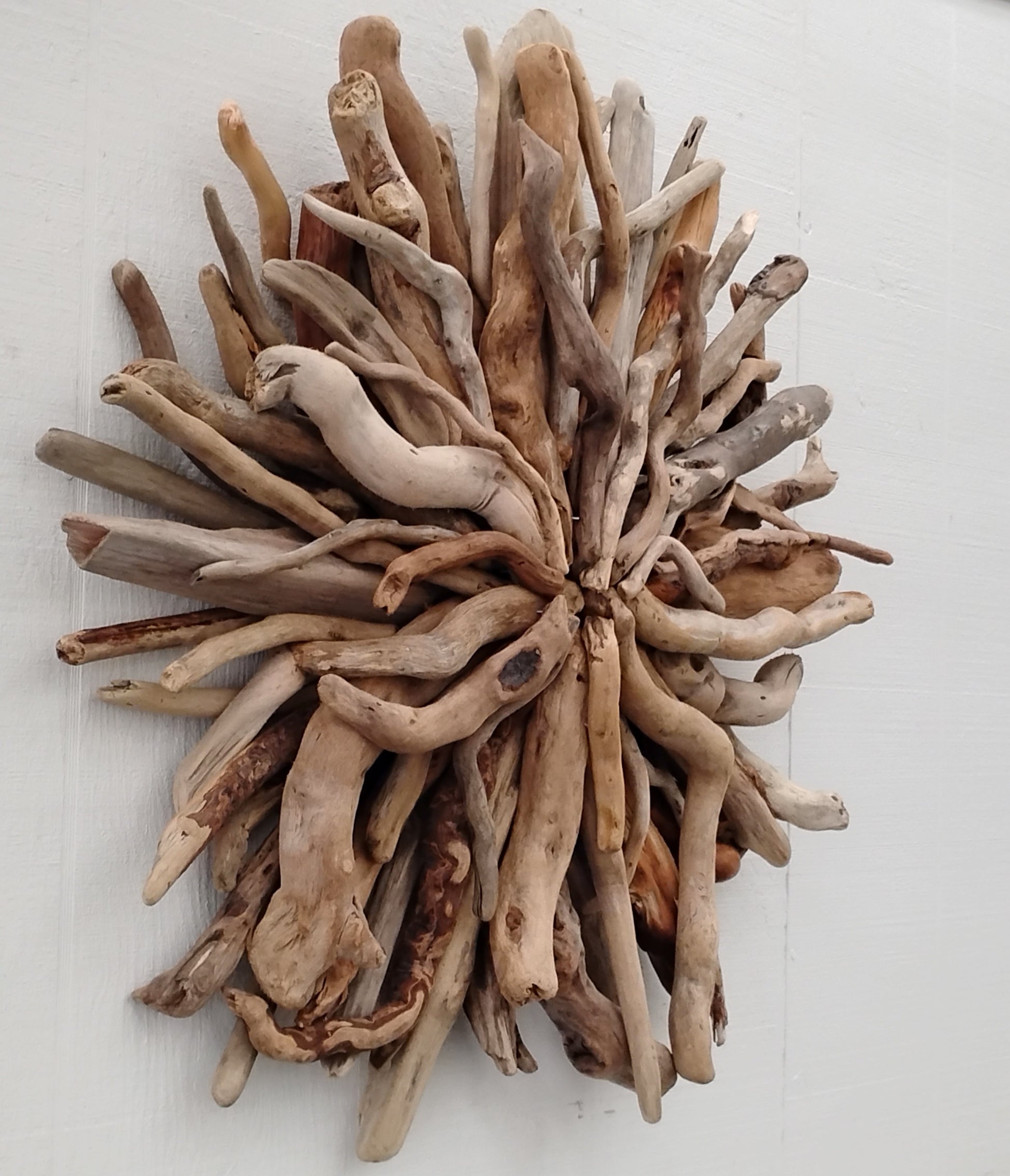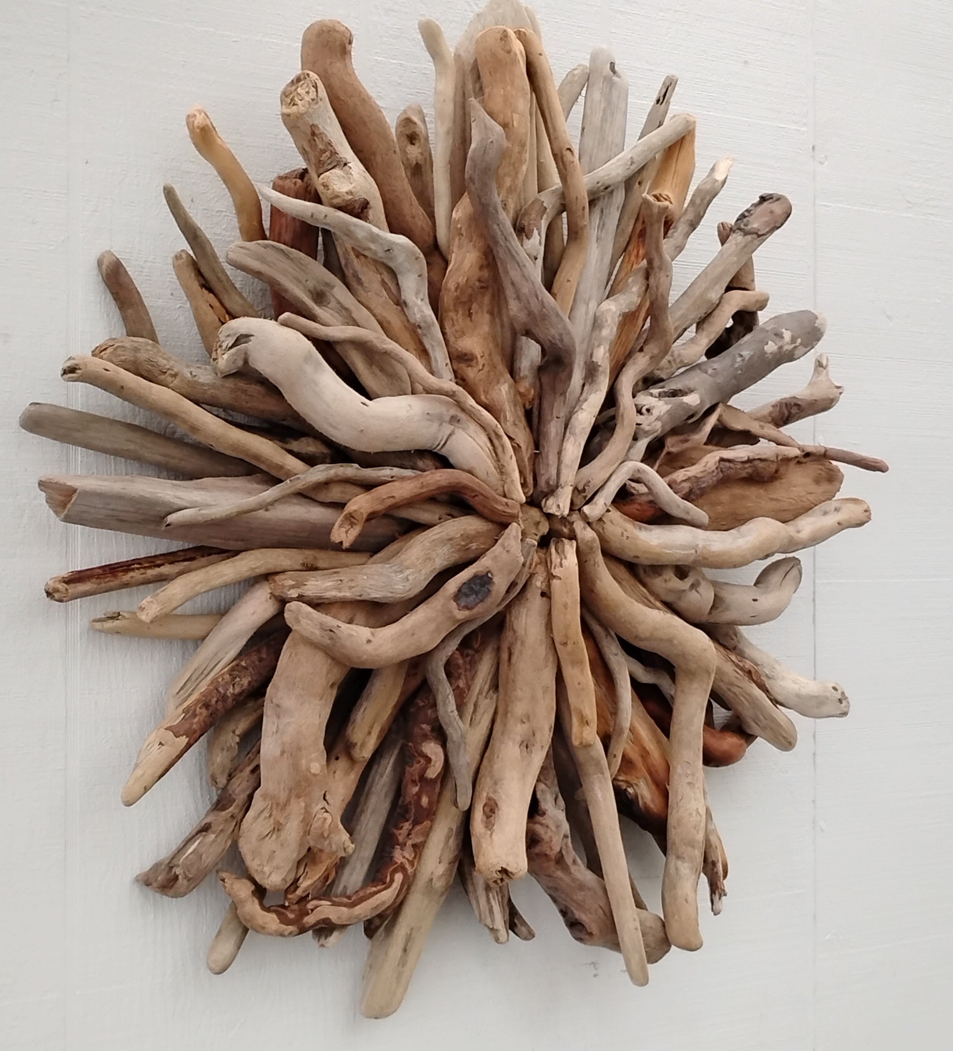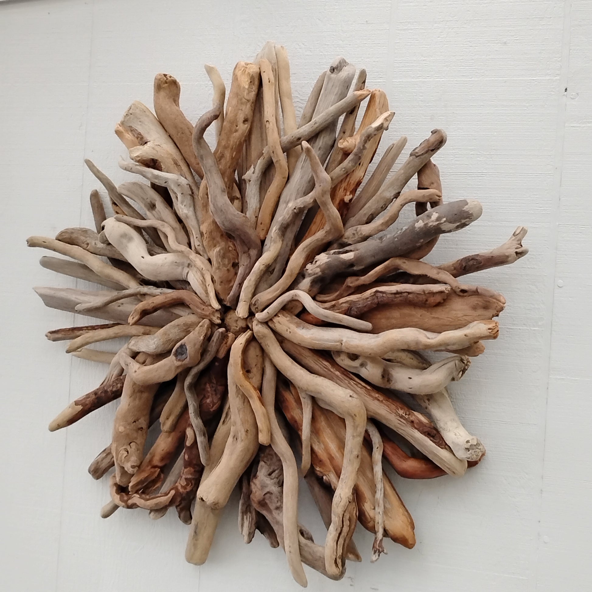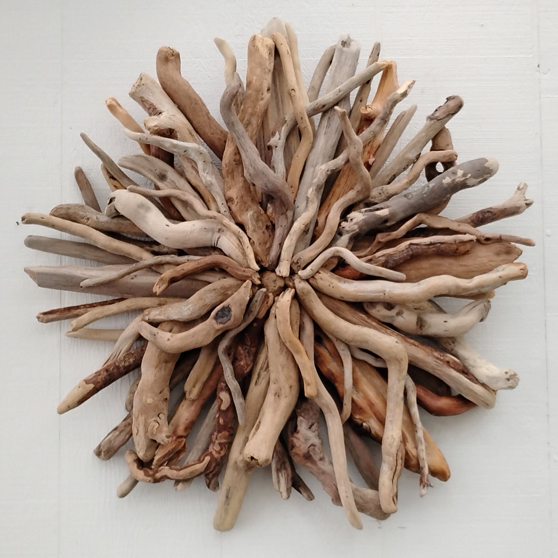 This unique and natural starburst round wall sculpture measures 27 x 27 inches. I made it with driftwood I collected along the beaches of Oregon.