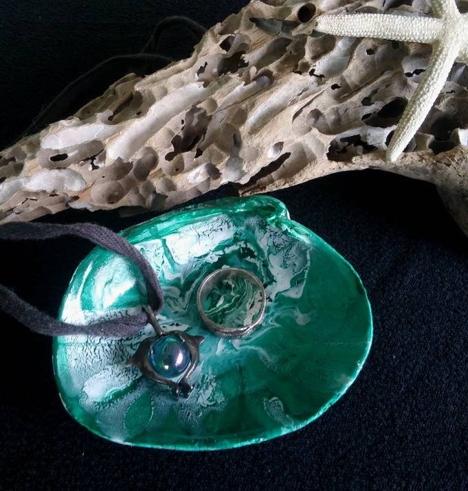 This listing is for the two Green and white clam shell that is pictured. They measure approximately measures 3.5x3 inches. I have sealed the painted clam shells with a weather sealer to protect the finish. Decorative shells like these are a lovely way to store rings and trinkets on a bedroom side table, or end table. They are beautiful in the bathroom as well as porches and patios.