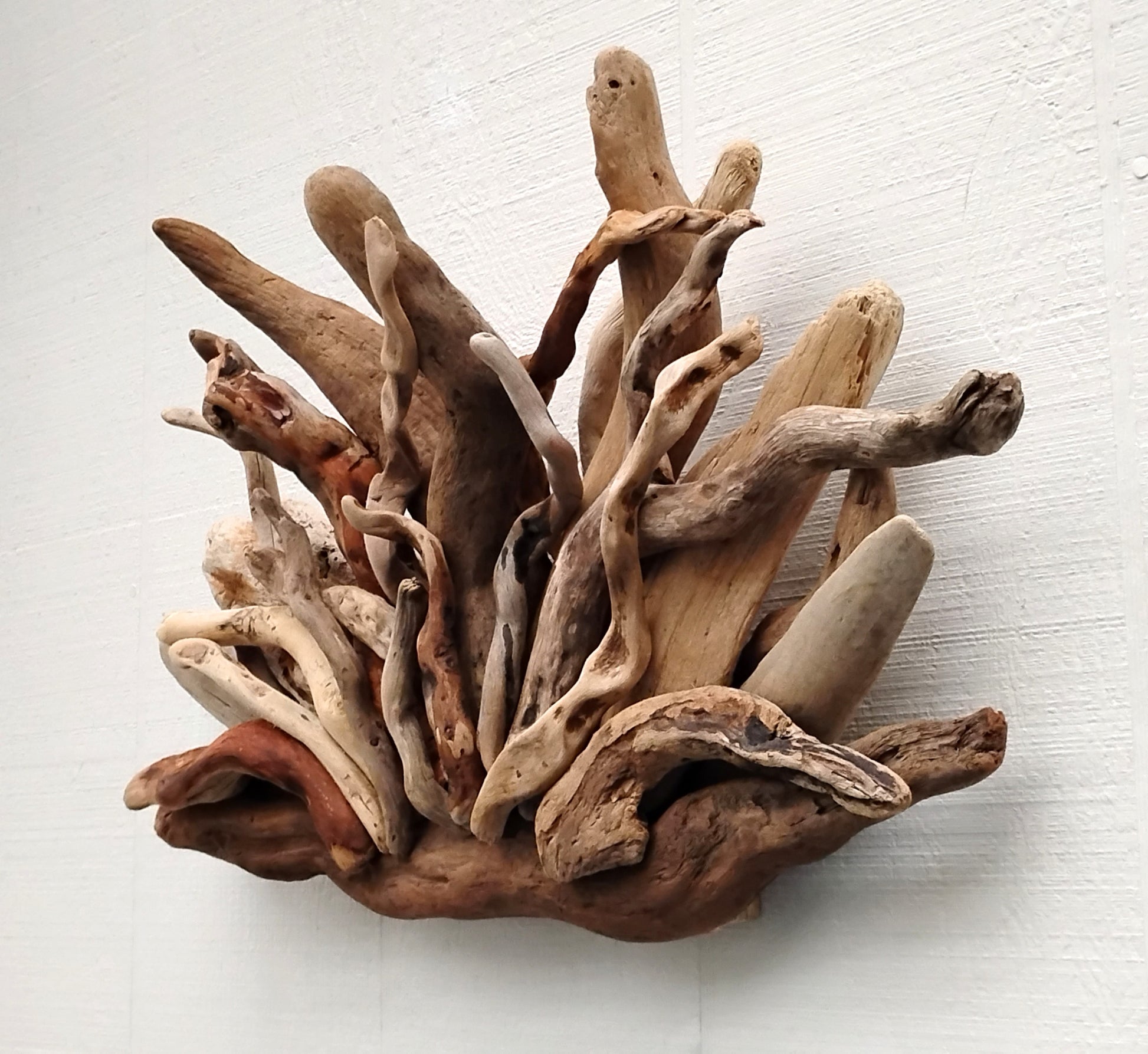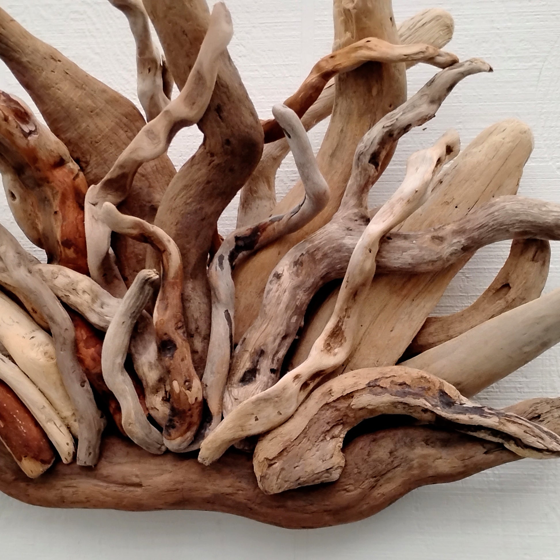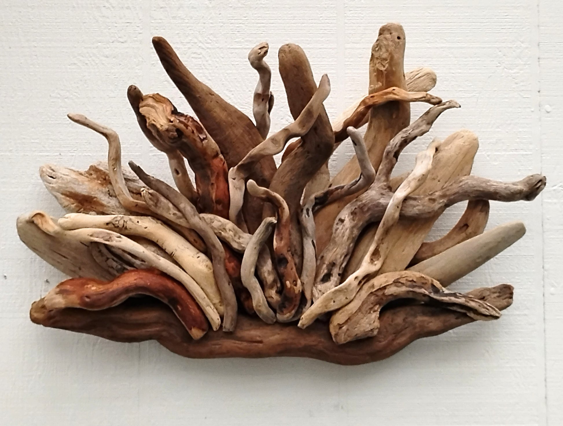 Each sculpture is unique using hand selected driftwood pieces attached one at a time using a nails for strength and durability. I have not treated the driftwood in any way. The colors and shaped you see in this piece are all natural. I have also attached a saw tooth hanger in the back for easy hanging.