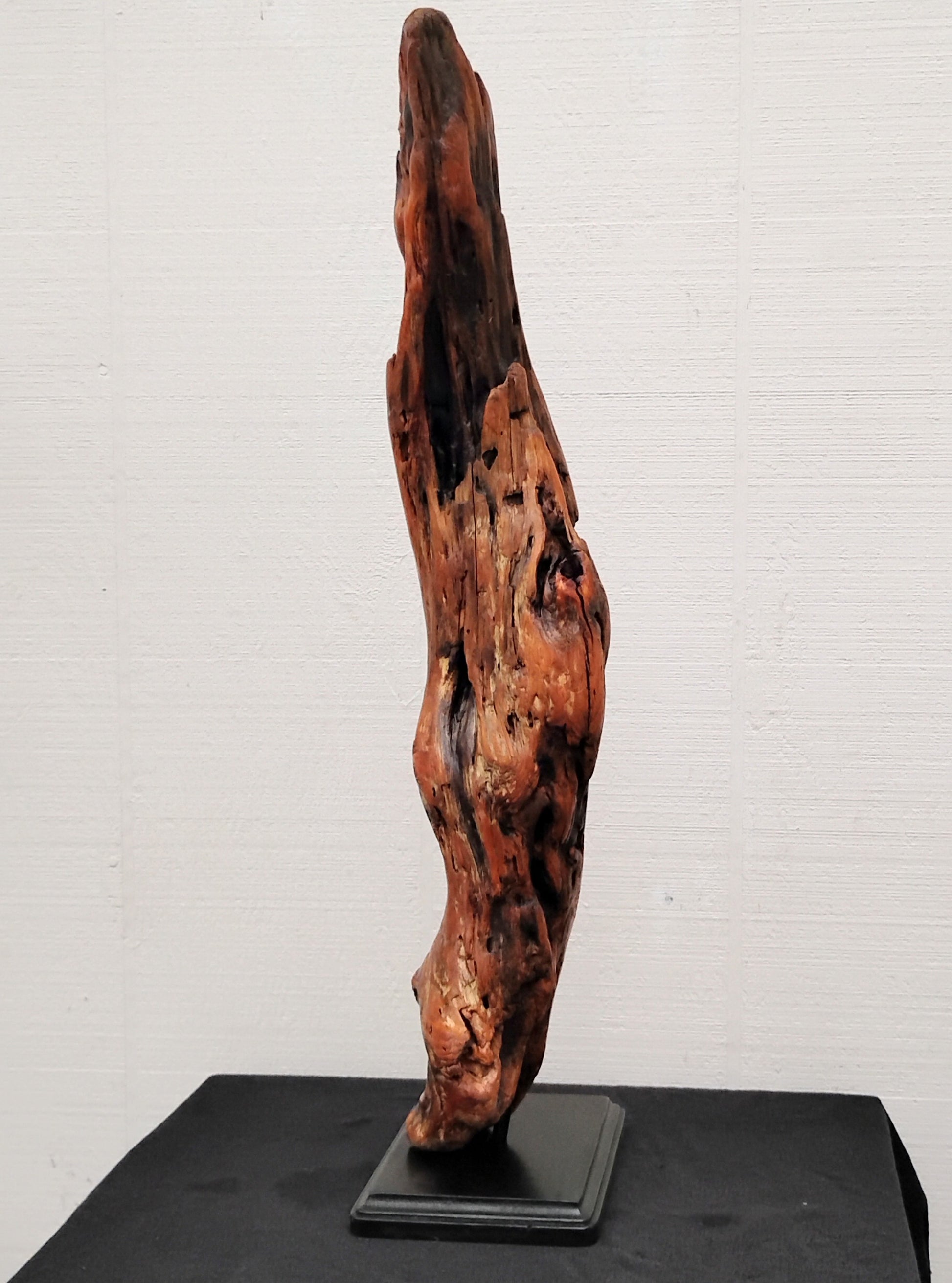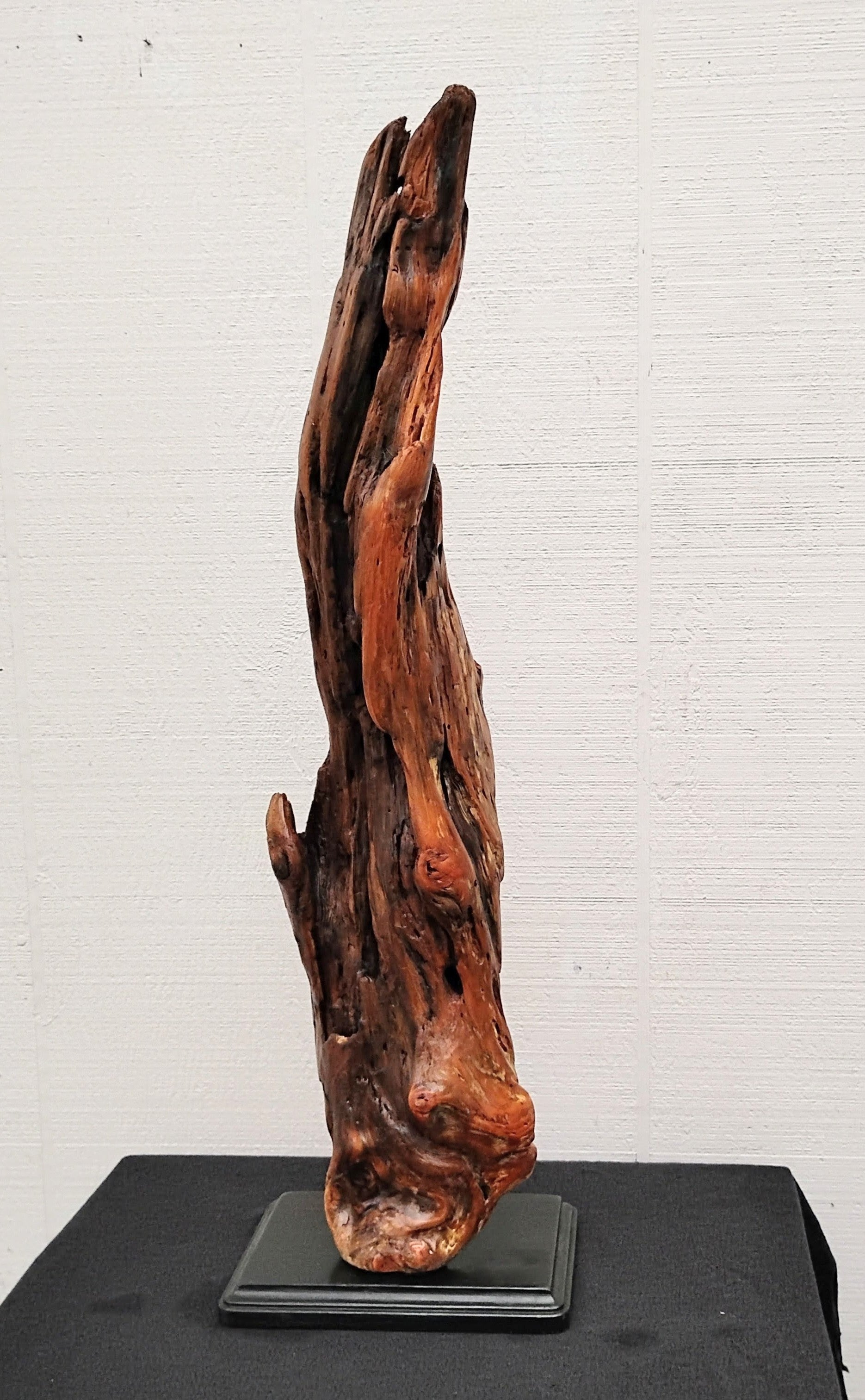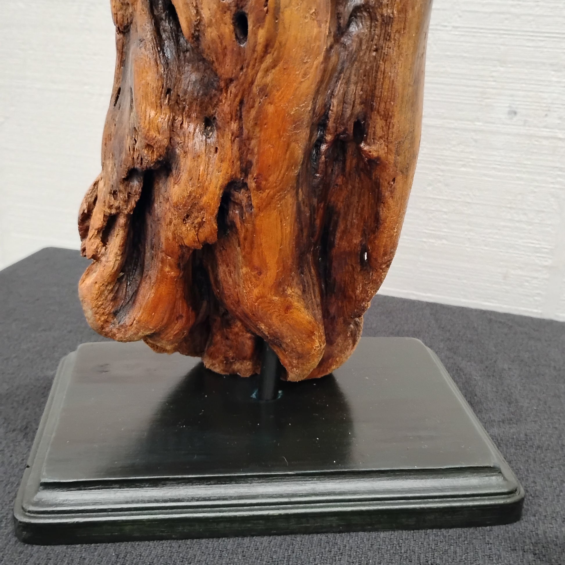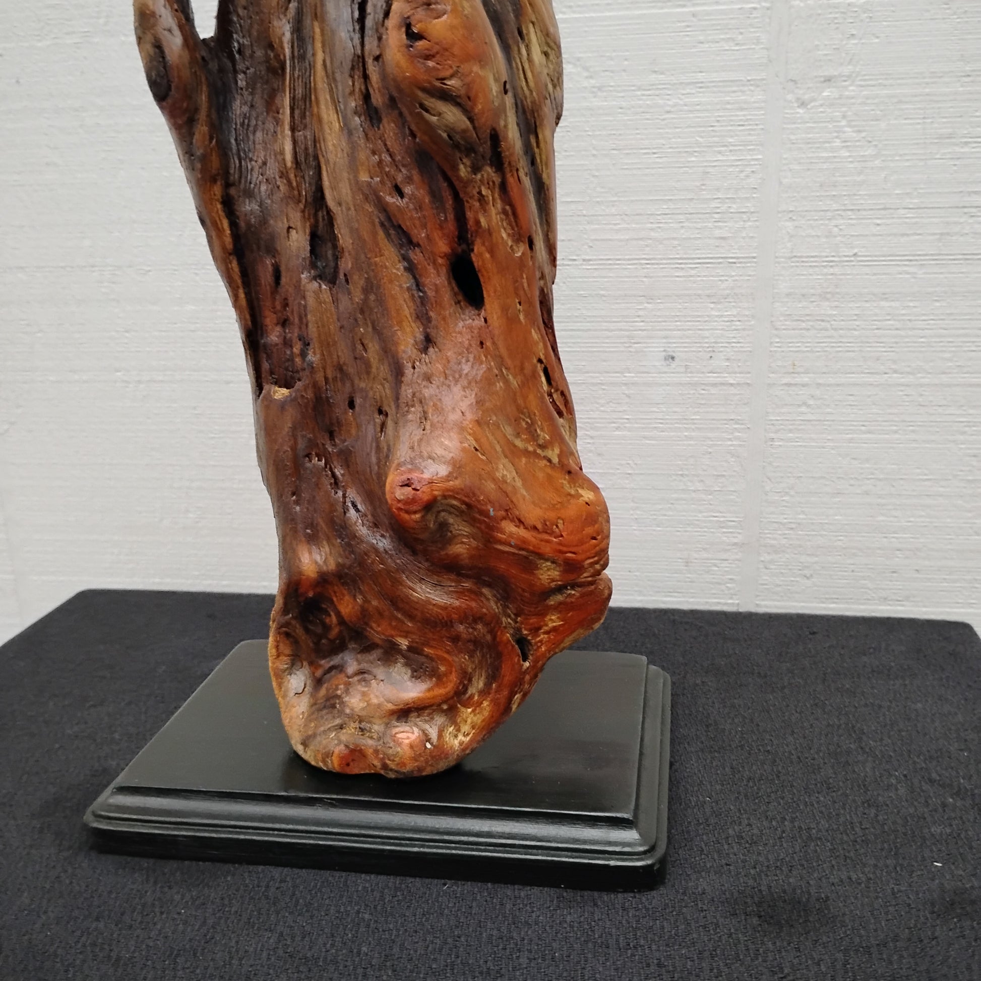 This unique and rare driftwood sculpture was handcrafted from a natural piece of driftwood that I have stabilized and cleaned up then attached to a wood base that I have painted black. I have sealed it with varnish for added protection and to bring out the awesome natural colors seen in this piece. This sculpture including the base measures approximately 24 x 5 inches. It was an amazing find as it was when I found it, so I decided to only clean it and make it a show piece. Adding a natural wood sculpture like this a simple way to bring natural elements into your home while making a beautiful visual statement as well.